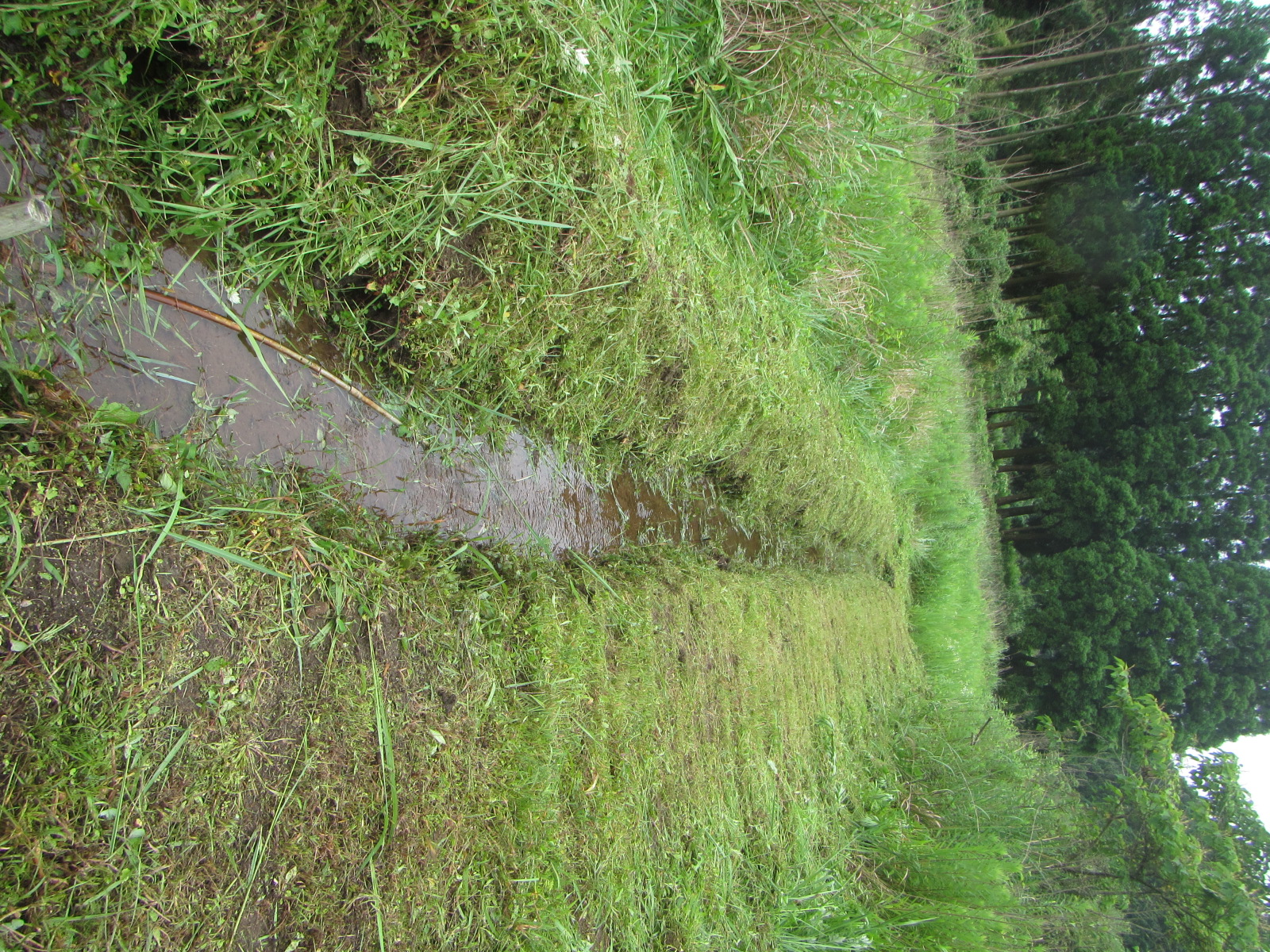 R5.7.17 メダカ川 草刈り、しました。暑い中大変です、 湧き水の水路(土側溝)です。メダカが生息するよう清掃・草刈り等管理してます。